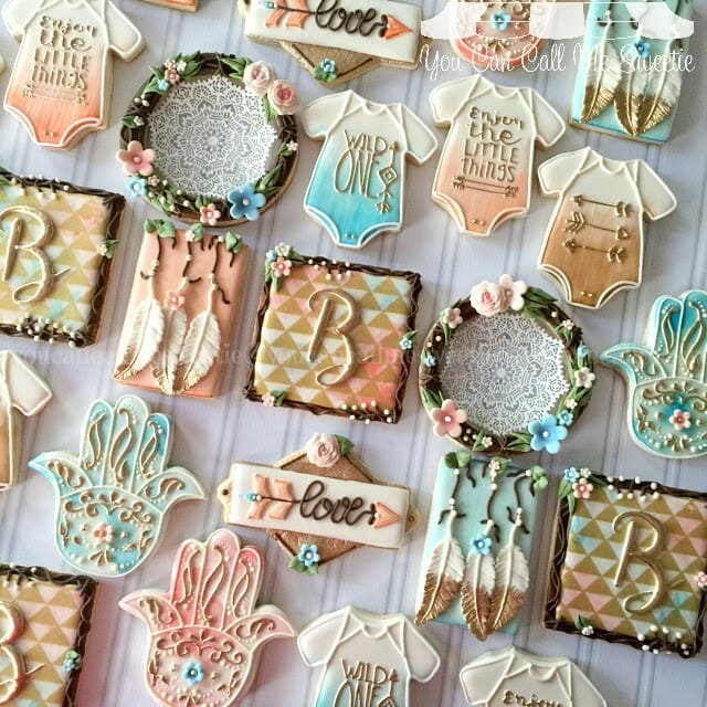 The last class will be Bohemian Love Cookie Collection. This class will be held on Monday afternoon. Sandra will be teaching students 10-12 cookies from this collection so that they can create on trend bohemian parties or fun and funky gender reveal parties and baby showers! In this class Sandra will be teaching just as many techniques as the previous two: piping, flooding, working with different royal icing consistencies, watercolor technique on royal icing, airbrushing, piping letters, working with edible lace, working with fondant accents, intricate piping, working with gold highlighters, and much more!
